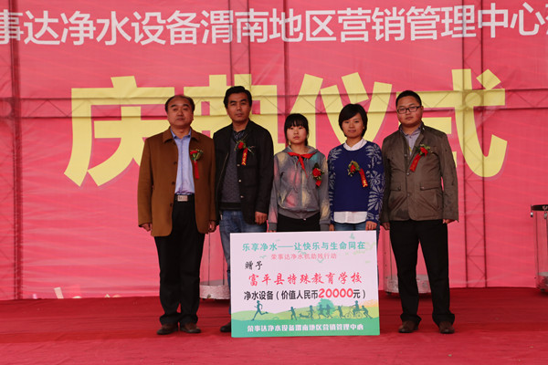 2015年1月12日,榮事達水工業(yè)公司與安徽省青年志愿者協(xié)會共同發(fā)起了一項范圍覆蓋全國的大型助殘公益行動“樂享凈水——讓快樂與生命同在”。此次活動通過向不符合“國家生活飲用水衛(wèi)生標準”的康復(fù)中心、特殊學校、助殘機構(gòu)等捐贈凈水設(shè)備以及提供志愿服務(wù),積極改善當?shù)貧埣踩说娘嬎顮顟B(tài),以實際行動喚起社會對殘疾群體的重視與關(guān)愛。