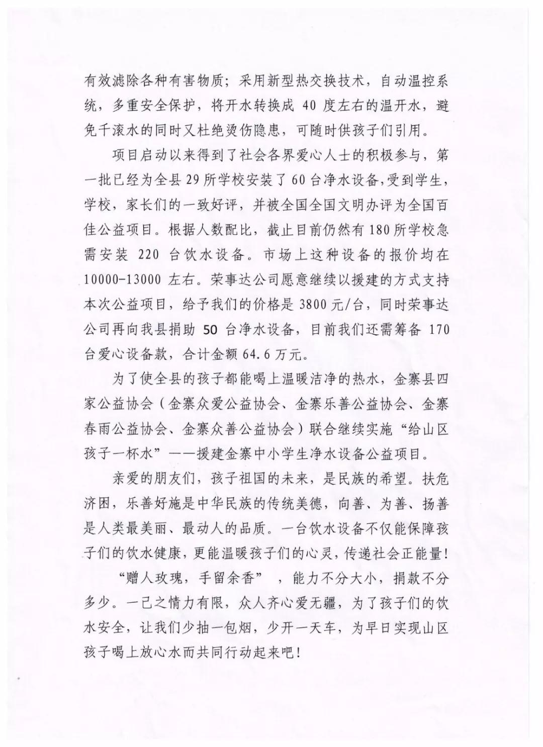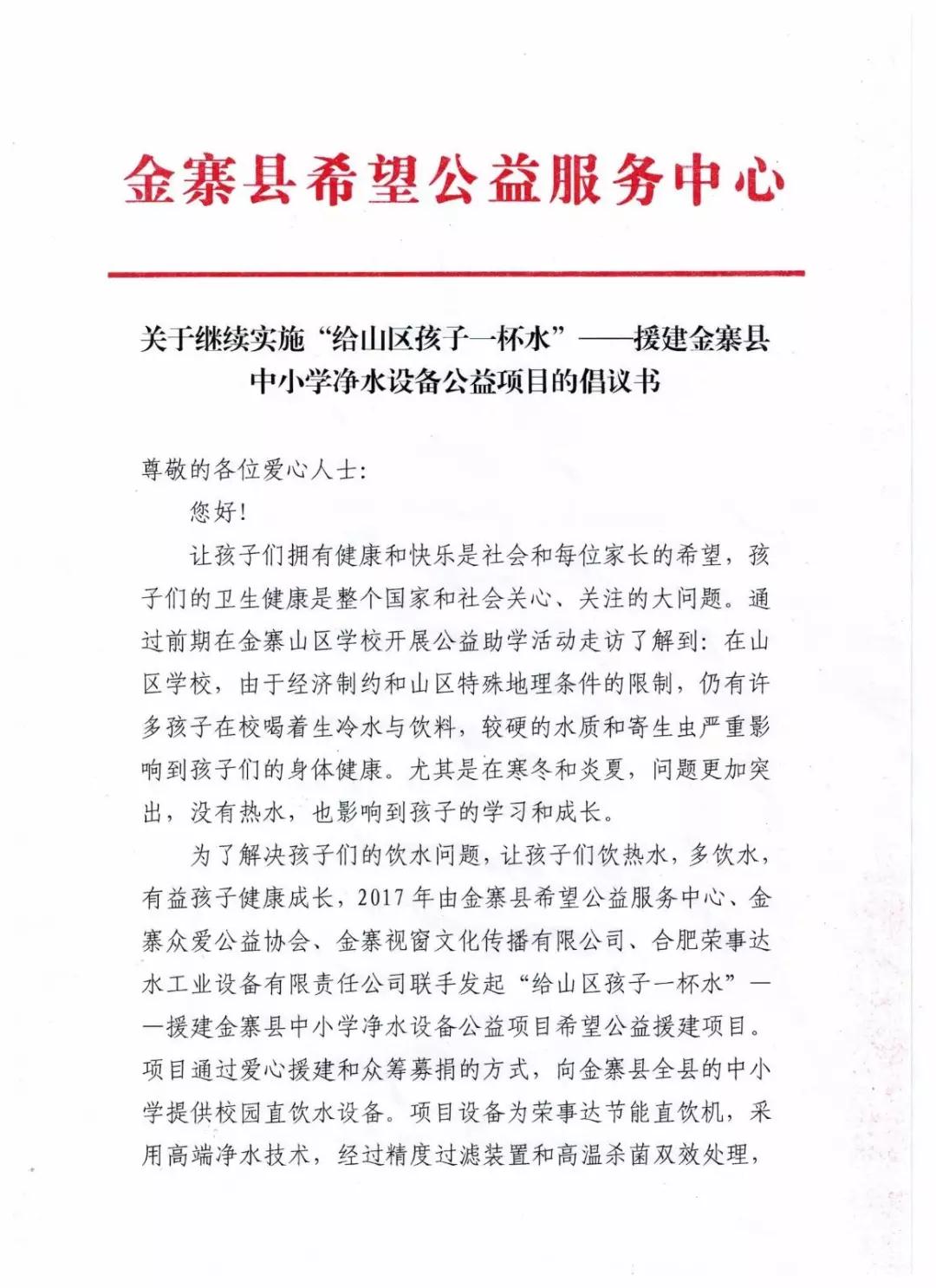 援建金寨縣中小學凈水設備公益項目的倡議書