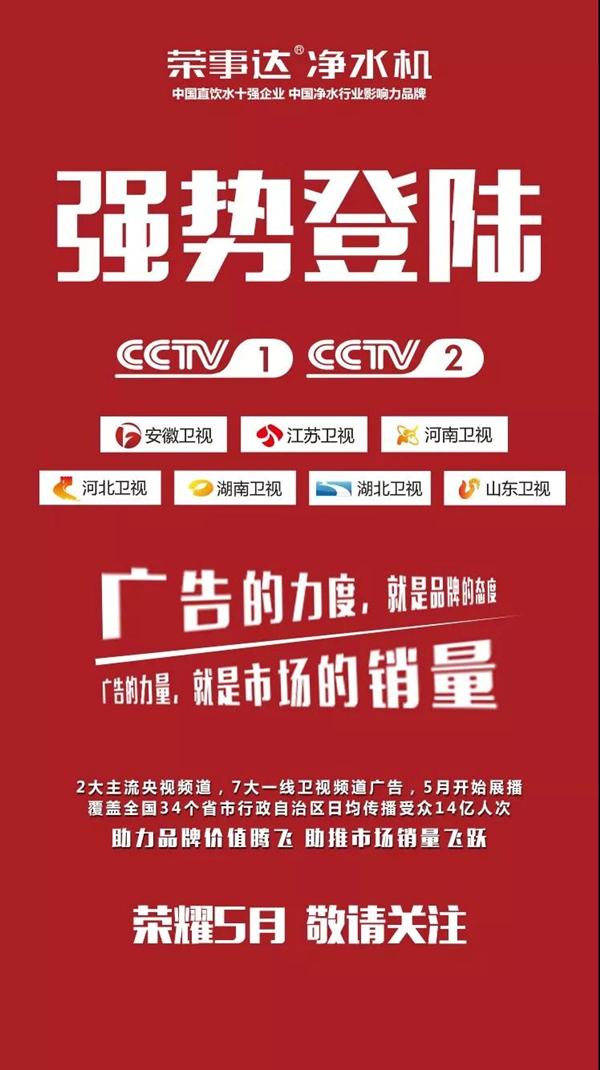 記者了解到,5月下旬,榮事達(dá)凈水機(jī)2018廣告新片將率先登陸CCTV1、CCTV2兩大央視平臺,屆時將向全國觀眾呈現(xiàn)榮事達(dá)獨(dú)特的精神理念與品牌形象。