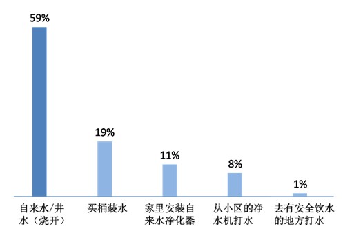 圖1. 對所住地區(qū)自來水的直觀感受另外有兩成(21%)被訪者表示“不清楚,喝不出好壞”——百姓飲用水成本越來越高,為了水杯里的安全,多數(shù)人選擇水消費(fèi):購買桶裝水、安裝自來水凈化器、從小區(qū)凈水機(jī)打水成為主流選擇,購買安全飲水正為成百姓居家繼“柴米油鹽醬醋茶”之后的“開門第八件事”。六成(59%)被訪者平時(shí)飲用水的最主要來源是“自來水/井水(燒開)”。也有不少人購買桶裝水(19%)或是從小區(qū)凈水機(jī)打水(8%)來飲用?!凹依锇惭b自來水凈化器”的被訪者也不少,為11%。
