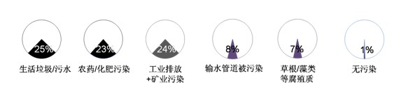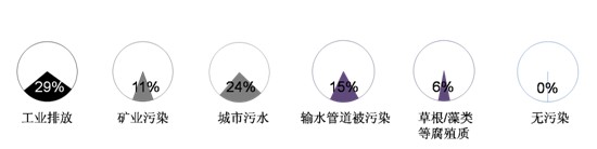圖2. 家庭飲用水的主要來源工礦產(chǎn)業(yè)、農(nóng)藥化肥、生活污水成百姓飲水安全三大“攔路虎”本次調(diào)查分別向被訪者所感受到的城市鄉(xiāng)村的水污染情況進(jìn)行了解,其中重點(diǎn)調(diào)查了百姓認(rèn)識(shí)到的本地水污染的源頭。——污染源:城市水污染主要與產(chǎn)業(yè)結(jié)構(gòu)有關(guān),工業(yè)排放(29%)和“礦業(yè)污染”(11%)對水資源的污染占到四成。值得關(guān)注的是,“城市污水”污染被24%被訪者認(rèn)為其是主要污染源。蘭州水污染事件讓人們注意到了“輸水管道被污染”對水安全造成的影響,15%被訪者認(rèn)為自己所住城市的水污染受此影響。有專家分析水污染,認(rèn)為“草根、藻類等腐殖質(zhì)”是主要原因之一,被訪者中6%接受這一看法。