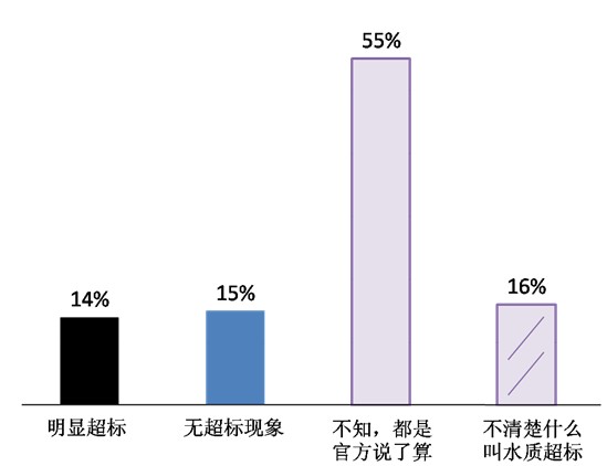 圖4. 居住在鄉(xiāng)村的受訪者對污染源的感受水安全信息“后知后覺”,百姓健康權(quán)利被透支本次調(diào)查的結(jié)果,體現(xiàn)出了水污染的嚴(yán)重程度、最主要的污染源等問題,然而比這些問題更值得關(guān)注的現(xiàn)象,是人們對攸關(guān)家人健康的環(huán)境信息的“后知后覺”、獲取水環(huán)境信息時(shí)的困難。據(jù)環(huán)保部今年3月14日發(fā)布的研究結(jié)果顯示,全國2.8億居民飲用水存在不安全問題。但是,當(dāng)我們問到“據(jù)您所知,所住地區(qū)是否有飲用水超標(biāo)現(xiàn)象”時(shí),并沒能直接得到關(guān)于百姓身邊飲用水超標(biāo)程度的認(rèn)知結(jié)果,數(shù)據(jù)呈現(xiàn)的是人們對“飲用水水超標(biāo)”問題的無奈。——對于“水杯里的飲水安全”,只有不到三成的被訪者給了我們“明顯超標(biāo)”(14%)或“沒有超標(biāo)現(xiàn)象”(15%)的明確答案。七成被訪者對此一片茫然:55%被訪者表示“不知道,超不超標(biāo)都是官方說了算”,16%的人甚至“不清楚什么叫水質(zhì)超標(biāo)”。