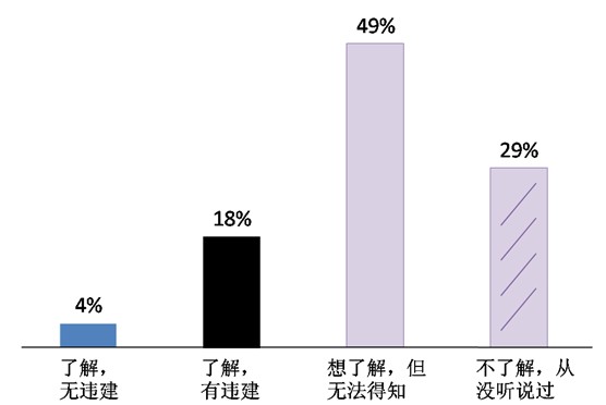 圖5. 對所住地區(qū)飲用水水質(zhì)超標(biāo)現(xiàn)象的感受我國劃分了飲用水水源的一級、二級保護(hù)區(qū)?!吨腥A人民共和國水污染防治法》規(guī)定,在一級保護(hù)區(qū)內(nèi),禁止與供水設(shè)施和保護(hù)水源無關(guān)的建設(shè)項(xiàng)目;二級保護(hù)區(qū)內(nèi),禁止排放污染物的建設(shè)項(xiàng)目。——對“飲用水水源保護(hù)區(qū)”這一攸關(guān)群眾飲水安全和健康權(quán)的規(guī)定,只有兩成群眾表示“了解”,并明確地告訴我們“有違建項(xiàng)目”(18%)或“無違建項(xiàng)目”(4%)。八成被訪者對此并不知曉,29%的人“從沒聽說過”,也并沒有想要了解的意愿。半數(shù)(49%)被訪者“想了解”,但無奈于“信息不透明,無法得知”。
