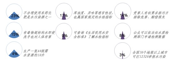 圖6. 對所住地區(qū)“飲用水水源保護(hù)區(qū)”保護(hù)情況的了解本次調(diào)查同時(shí)詢問了被訪者對一些水安全知識(shí)的認(rèn)知相對而言,人們對一些科普、知識(shí)性的信息認(rèn)知度較高,“過量、不合理使用化肥、農(nóng)藥是水污染源之一”已經(jīng)較為廣泛地被人們所了解(23%);不少人也清楚“汞、砷等有毒物超標(biāo)的水即使只是洗手也會(huì)對人體有害”(15%),即使是“生產(chǎn)一張A4紙所需要的水資源約10升”這樣的“冷知識(shí)”,也有一定被訪者有所了解(4%)。——對于自己在水安全方面,有哪些權(quán)利、如何維護(hù)等問題,人們有所了解,但人數(shù)比例較低。例如17%知道“渾濁度、異味等感官性狀,也屬于國家規(guī)定的水質(zhì)檢測指標(biāo)”,而只有9%的人知道“想了解水質(zhì)檢測有哪些指標(biāo),可查詢《生活飲用水安全標(biāo)準(zhǔn)》”;在維權(quán)方面,14%被訪者知道“受害人有權(quán)要求排污方排除危害、賠償損失”,8%知道“公眾可以依法向水質(zhì)檢測部門申請檢測數(shù)據(jù)”,“目前全國有30個(gè)地級以上城市可撥打12320舉報(bào)水污染事件”,但只有3%的被訪者了解這一點(diǎn),6%的被訪者對上述我們所提出的水安全知識(shí)表示“一概不知”。
