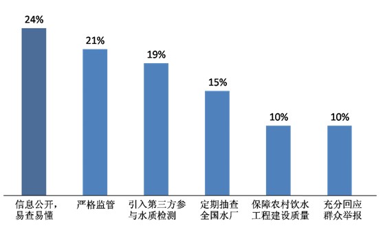 圖7. 被訪者對于水安全知識(shí)的了解情況改善“水杯民生”,當(dāng)從實(shí)現(xiàn)公民環(huán)境知情權(quán)開始當(dāng)我們問到“在水安全問題上,目前最希望政府做些什么”,不少被訪者選擇了“依法嚴(yán)格監(jiān)管”(21%)、“引入第三方參與水質(zhì)檢測”(19%)、“定期對全國的水廠進(jìn)行抽查”(15%)和“保障農(nóng)村飲水工程建設(shè)質(zhì)量”(10%)。然而比起這些“管控”措施,人們最希望的是“信息公開,并使公眾易查、易懂”(24%)。這充分體現(xiàn)了百姓對于維護(hù)自身環(huán)境健康權(quán)益的強(qiáng)烈需求:公民環(huán)境權(quán)益的實(shí)現(xiàn),離不開最起碼的環(huán)境知情權(quán)。一個(gè)愿意對環(huán)境安全負(fù)責(zé)任的政府,在作出公民環(huán)境參與的承諾之前,理應(yīng)讓每個(gè)公民對行政機(jī)關(guān)所持有的環(huán)境信息擁有適當(dāng)?shù)墨@得利用權(quán)。使水污染信息真實(shí)、透明、易查易懂,這既是本次調(diào)查中百姓對于當(dāng)前政府改善環(huán)境民生的迫切期待,也是中國推進(jìn)公民參與的環(huán)境法治的必經(jīng)之路。