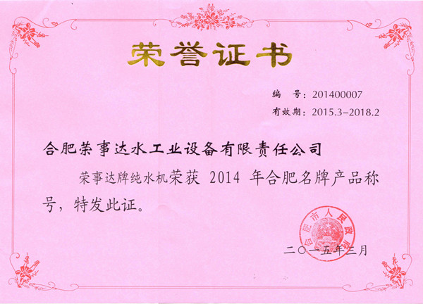 據悉,榮事達從事凈水行業10年,始終將質量作為企業生存和發展的原動力,注重計量、標準、認證認可、檢驗檢測等質量基礎建設,嚴格把控生產經營全過程,逐步建立公司測量管理體系并順利通過認證審核,以實際行動確保產品質量,保證消費者實際權益。此次榮事達牌純水機榮獲2014年合肥名牌產品稱號,是合肥市政府對榮事達水工業公司一直以來重視產品質量工作的高度認可。