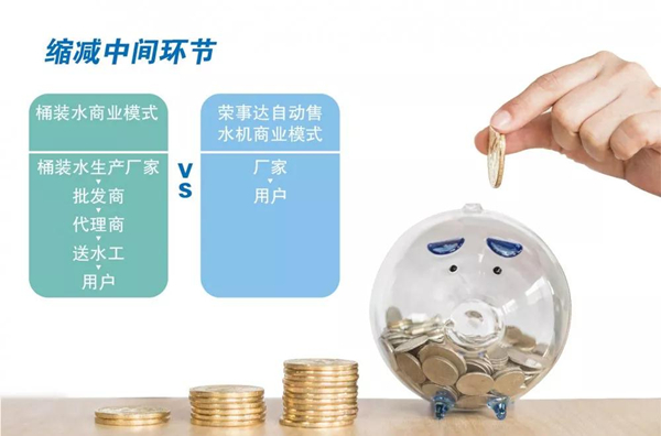 桶裝水的價格包含廠家生產成本、批發(fā)商差價、代理商差價、運輸成本、送水工人力成本等諸多費用,中間環(huán)節(jié)太多,最終還是有消費者買單,而自動售水機則是廠家直面用戶,大大縮減中間環(huán)節(jié),讓利于客戶,一桶水的價格相比市面上的品牌桶裝水價格要少50%以上,大大節(jié)省企業(yè)開支。
