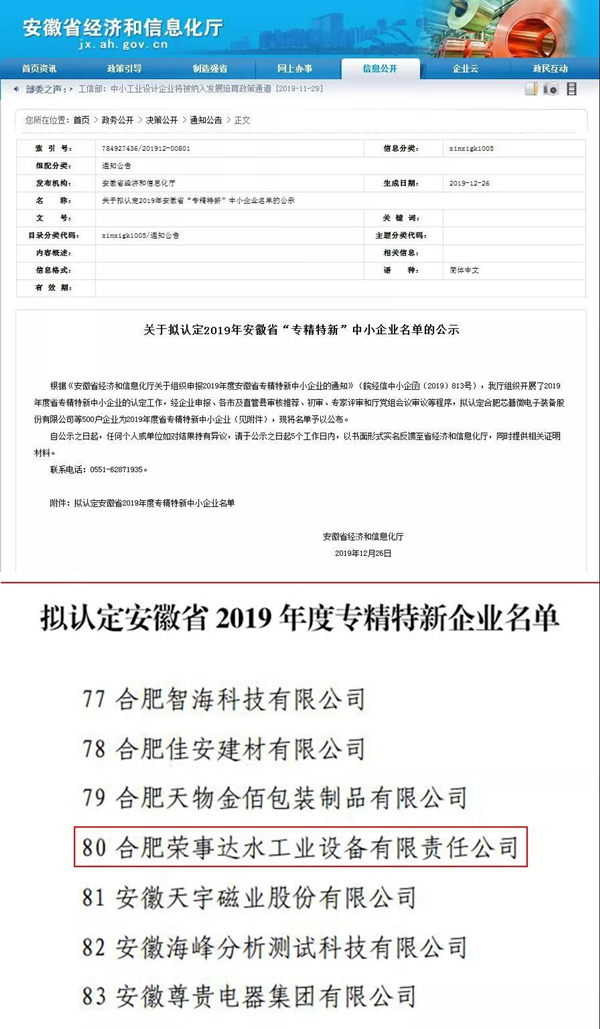 •        12月26日,安徽省經(jīng)濟(jì)和信息化廳公布了2019年安徽省“專精特新”企業(yè)名單,合肥榮事達(dá)水工業(yè)設(shè)備有限責(zé)任公司憑借在專業(yè)化、精細(xì)化、特色化和創(chuàng)新化方面的獨(dú)特優(yōu)勢成功入選。