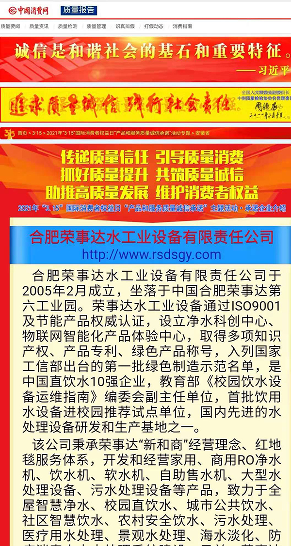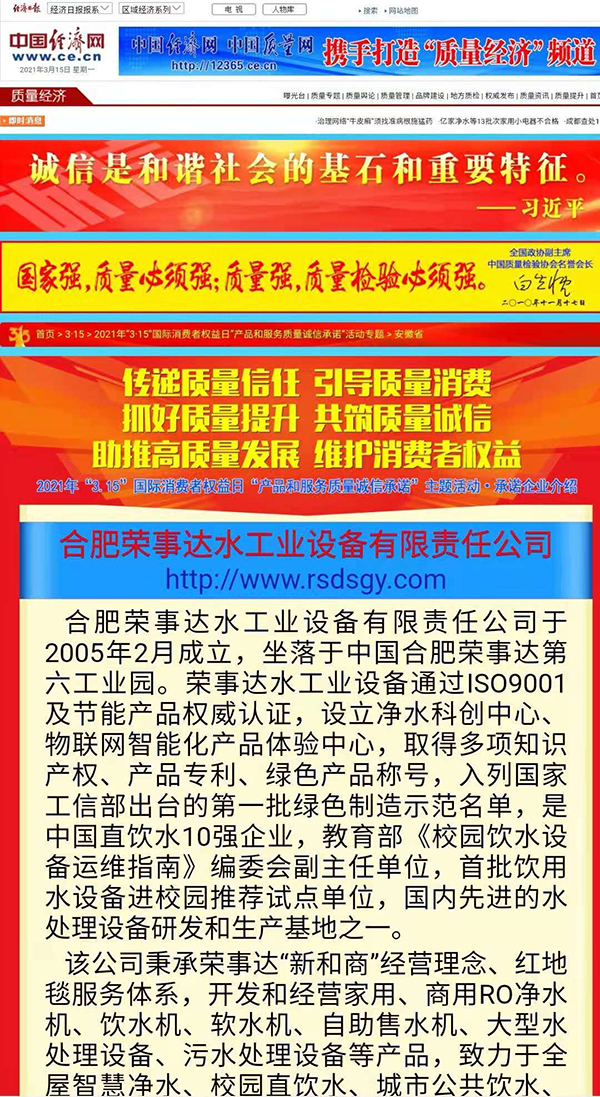 •   共筑質量誠信,引導質量消費。在由中國質量檢驗協會主辦的2021年“3.15”產品和服務質量誠信承諾的主題活動中,榮事達憑借卓越的產品品質及良好的社會形象,獲得協會以及權威專家的一致認可,榮膺 “全國產品和服務質量誠信示范企業”“全國質量信得過產品”“全國凈水行業質量領先品牌” “全國質量誠信先進企業”多項榮譽,《中國質量報》、《中國消費者報》及中國質量網、中國經濟網、中國消費網等多家媒體均予以集中展示和公告。