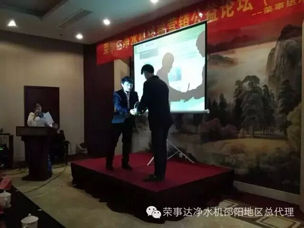 特殊教育學校負責人現場接受了捐贈,同時,在榮事達凈水機邵陽所有經銷商的見證下,榮事達西南西北地區總監孫長華為邵陽管理中心頒發了“樂享凈水 愛心代理商”的獎杯。