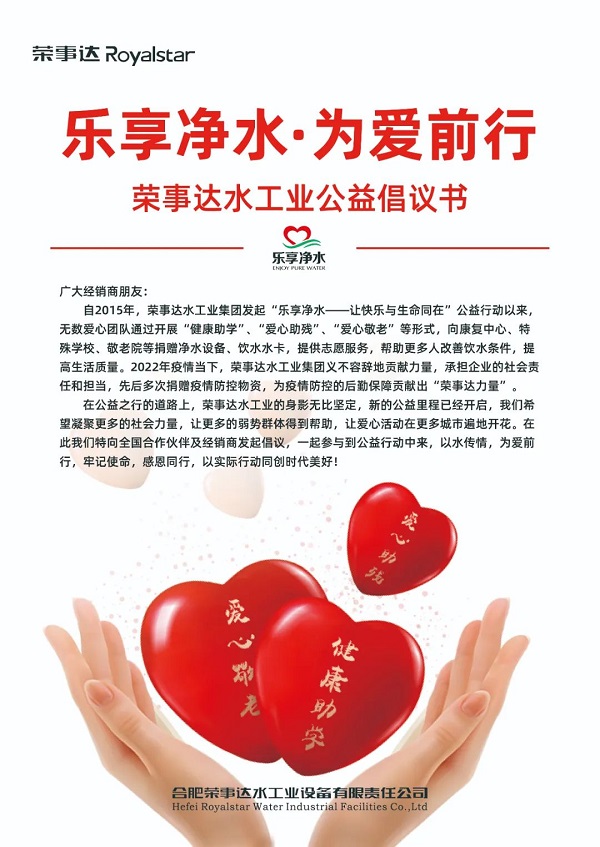 - 榮事達水工業(yè)向全國各地合作伙伴及經(jīng)銷商發(fā)起公益倡議,呼吁大家一起參與到公益行動中來,以水傳情,為愛前行,牢記使命,感恩同行,以實際行動同創(chuàng)時代美好!